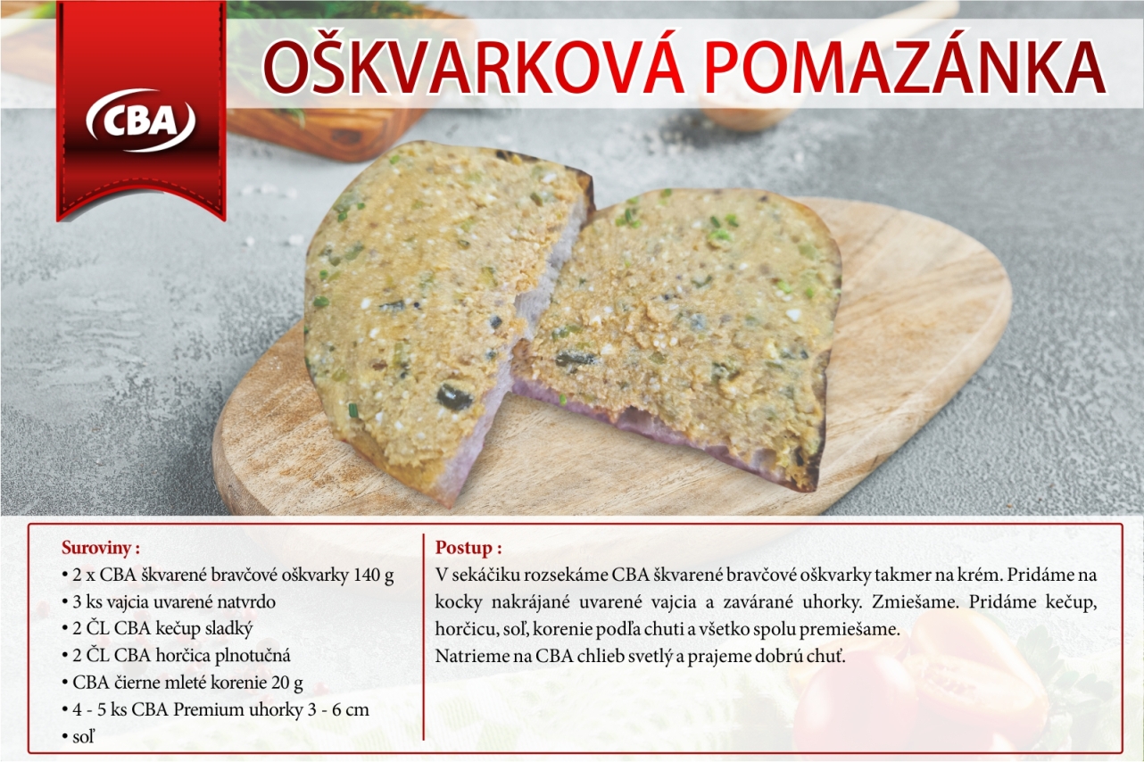 V sekáčiku rozsekáme CBA škvarené bravčové oškvarky takmer na krém. Pridáme na kocky nakrájané uvarené vajcia a zavárané uhorky. Zmiešame. Pridáme kečup, horčicu, soľ, korenie podľa chuti a všetko spolu premiešae.