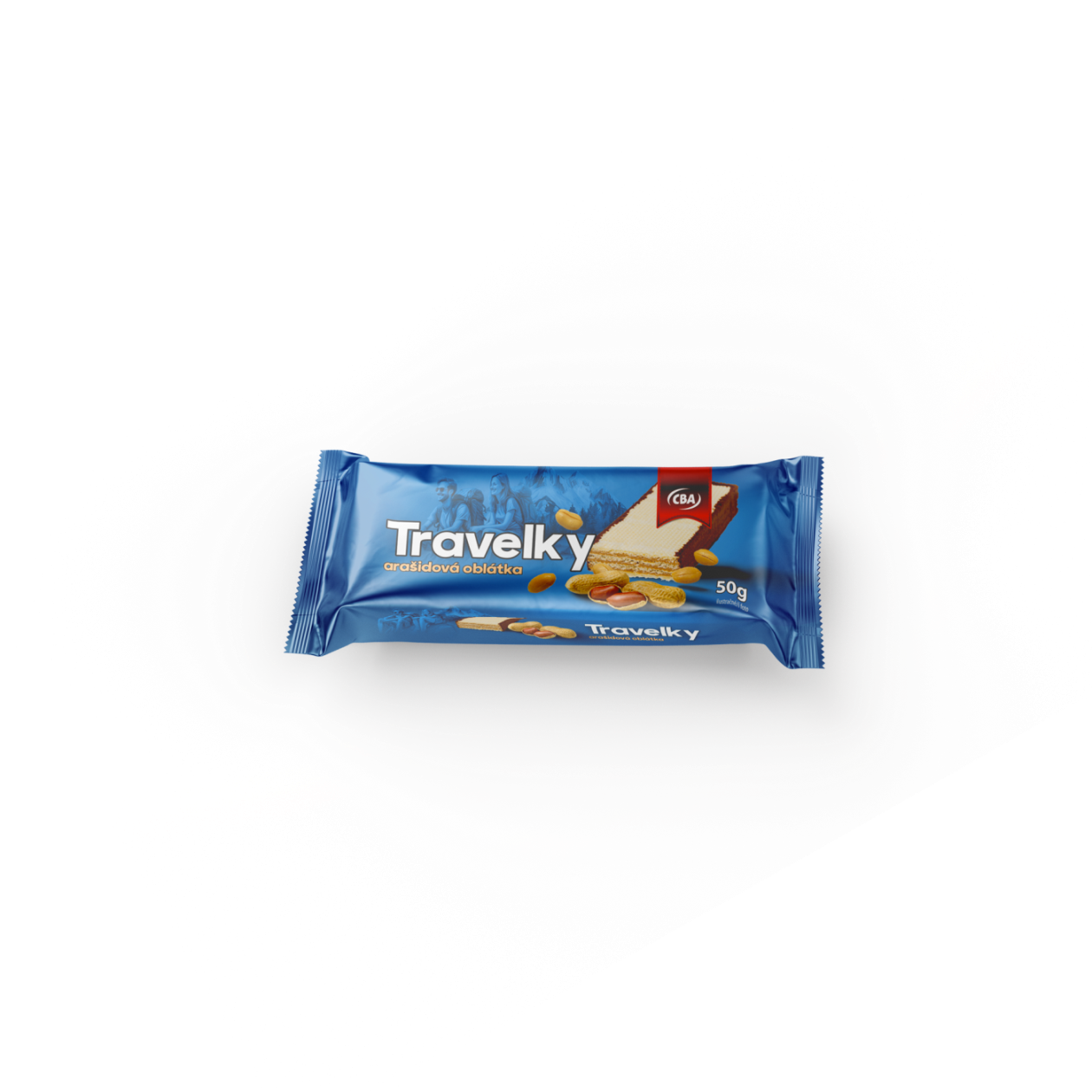 Oblátka s arašidovou krémovou náplňou (72 %) obvodovomáčaná kakaovou polevou.